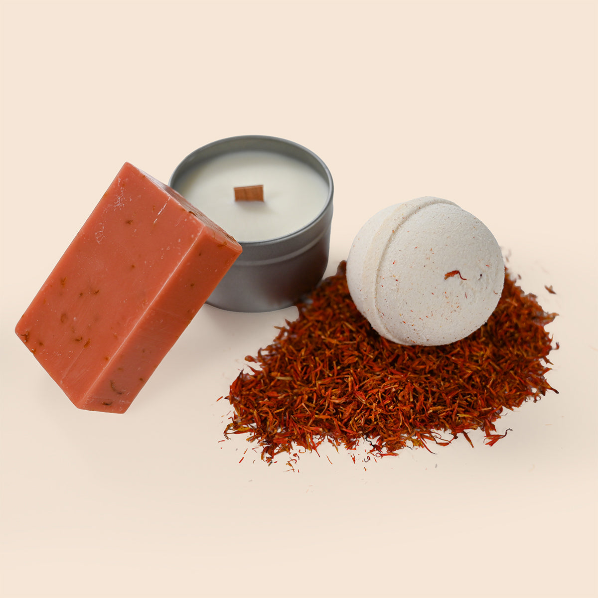 The Lather, Light, & Lavish Gift Set transforms any self-care evening into a serene retreat. Each trio pairs an all-natural soap, soothing bath bomb, and clean-burning soy candle in perfectly coordinated scents—created to calm the mind, nourish the skin, and fill the room with gentle, lasting fragrance.