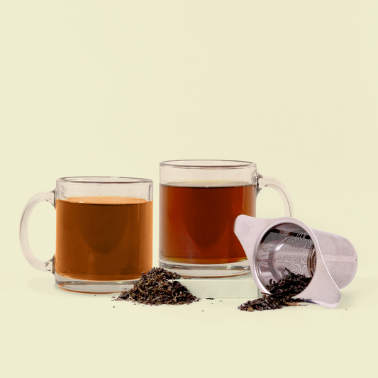 • A clear glass mug filled with brewed dark reddish-brown tea. In front of the mug is a small pile of loose leaf tea, showing the dry tea leaves and colorful additions before brewing. Keats & Co.