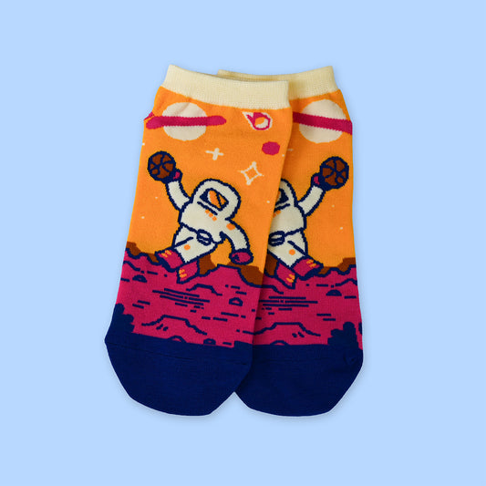 • Excited blonde woman in a pink dress displaying a colorful graphic sock with cartoon faces and the word "PEACE" against a bright blue background. She smiles enthusiastically while seated on a wooden chair, showing off the vibrant sock that features teal, purple, and yellow colors with comic-style artwork.