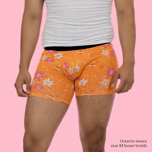 • he same three people, now photographed from the front, all smiling at the camera. They're wearing the same orange patterned underwear/shorts with white tops against the pink background, showing the inclusive sizing and diverse representation of the garment line.
