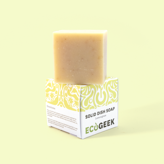 • The image shows a bar of unscented solid dish soap from the brand "ECOGEEK." The soap is a light beige/cream color and sits atop its green and white packaging. The packaging features a decorative green swirly pattern on the top portion and "SOLID DISH SOAP [Unscented]" written prominently. The ECOGEEK logo appears at the bottom of the packaging. The entire product is photographed against a pale yellow background, creating a clean, minimalist presentation. Solid dish soap from EcoGeek a Good Store product.