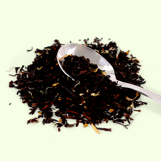 • A clear glass mug containing brewed dark reddish-brown tea. In front of the mug is a small pile of loose black tea leaves mixed with lighter colored ingredients.