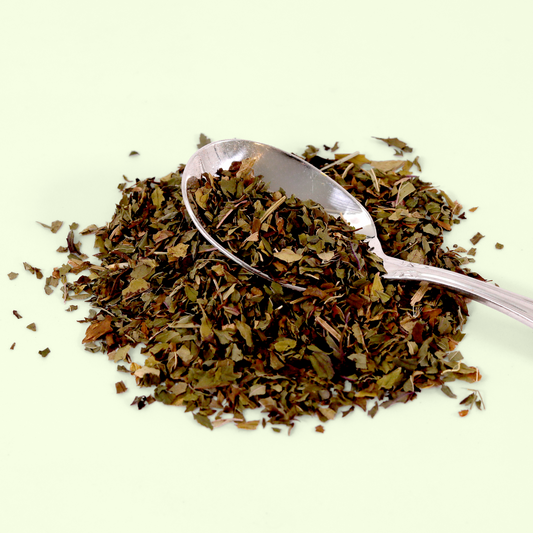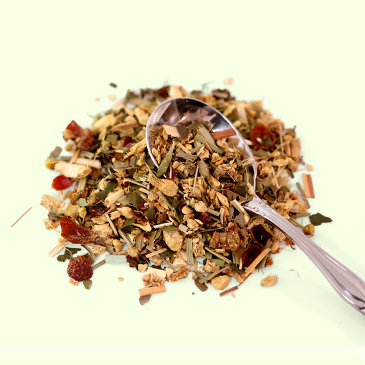 • A clear glass mug filled with brewed amber-colored tea. In front of the mug is a small pile of loose dried tea leaves and herbs in various shades of brown and green against a white background.